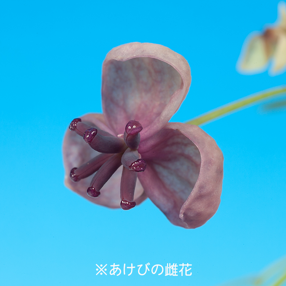 あけびは雄雌異花同株ですが自家不和合性のため、自家受粉では結実しにくい樹種です。他のあけびと人工交配させれば確実に実が止まります。