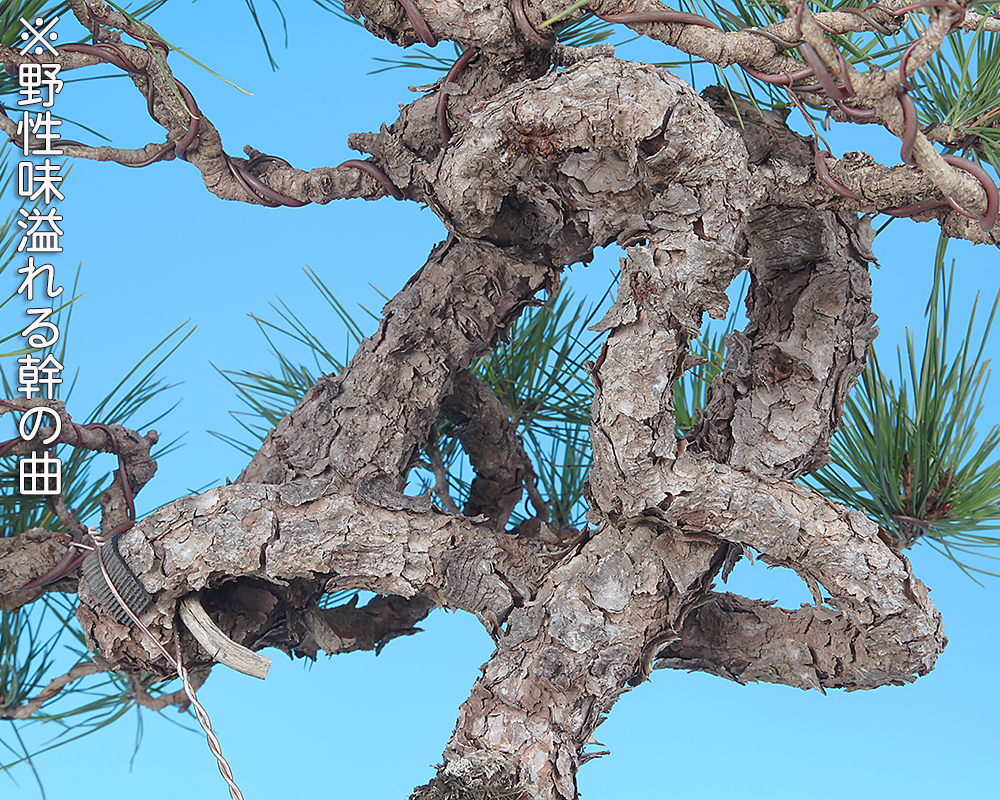 大きくループする幹模様が個性的な赤松。これだけの動きを見せる樹ながらコンパクトに収められている所も魅力です。幹に見る古色感も素晴らしく、赤松らしい自然味に富んだ一樹です。現状は幹模様に添わせて枝を置いて模様木樹形にまとめられていいますが、動きのある文人風に仕立てるのも面白い。樹形構想次第ではさらなる樹格向上も期待できる逸品です。