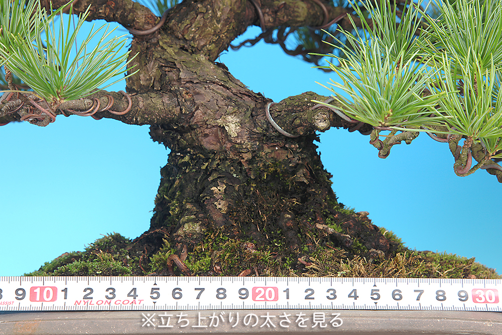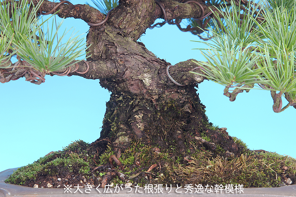 大きく広がった根張りからコケ順良く伸び上がる幹模様が美しい。また、模様を強調するように配置された役枝のバランスも素晴らしい一樹。サイズも中品盆栽に最適な寸法です。本性の五葉松として葉性も美しく、プロの整姿済みで中品五葉松の模様木として完璧な樹姿を見せる逸品。即展示可能な状態です。