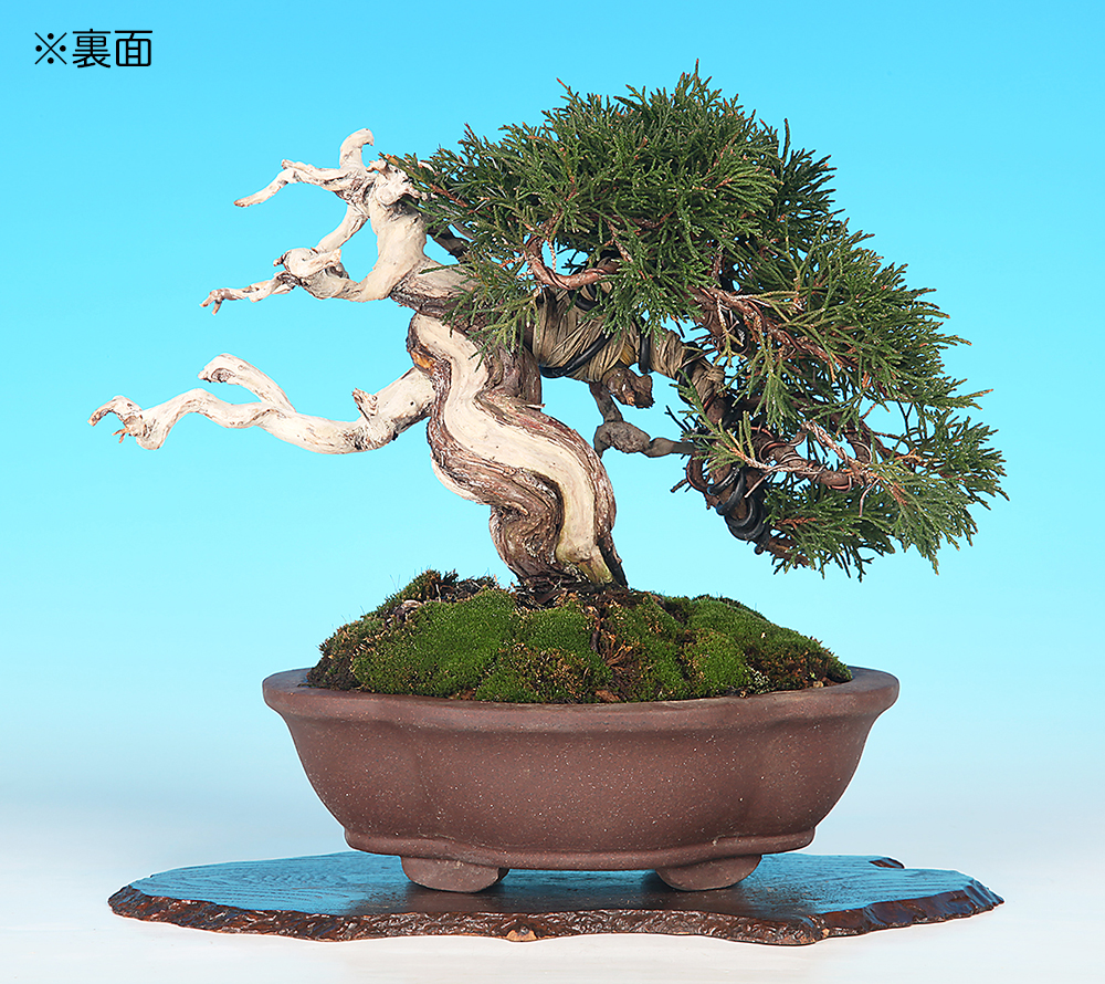 幹を曲げて模様木にまとめられた真柏。シャリや枝ジンの存在がよく利いており、数年の持ち込みで主木として使える姿に仕上がるだろう。