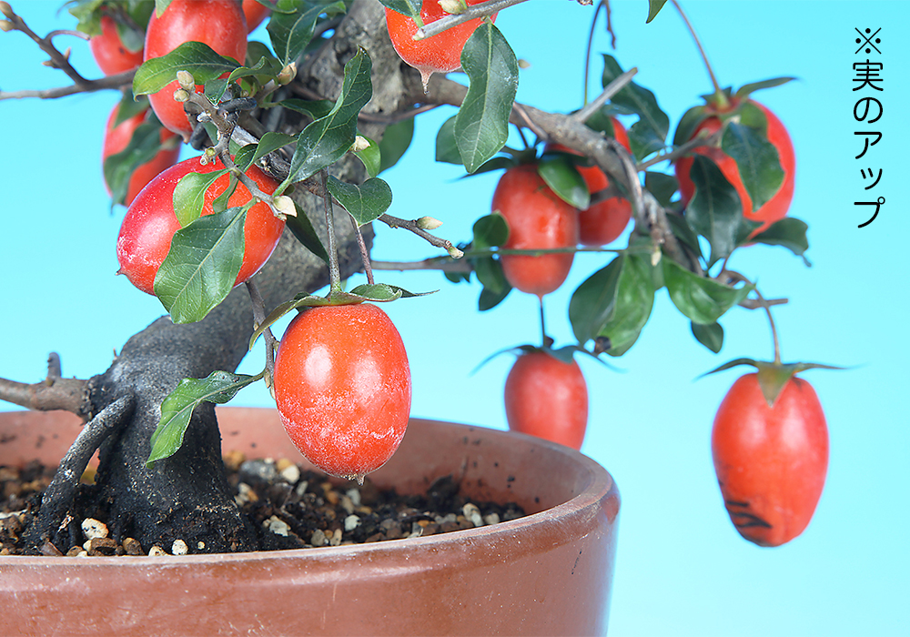 柿の常緑品種・常盤柿。老爺柿と違って、丸い小さな実が特徴です。小品栽に収まるサイズながら太さ十分の幹に秀逸な模様を有した優良素材。枝も混んでおり、完成度まであと少し。鉢替えをすれば、この秋には飾れます。