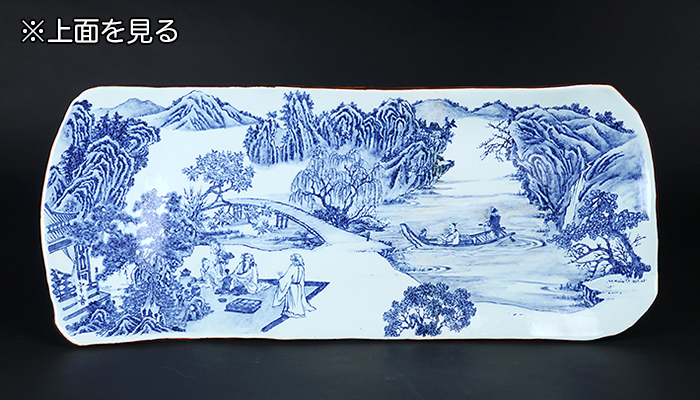 河のほとりで催された酒席と、舟でその集まりへと向かう人物の様子が描かれた大型の陶板。落款:宗善・宗善