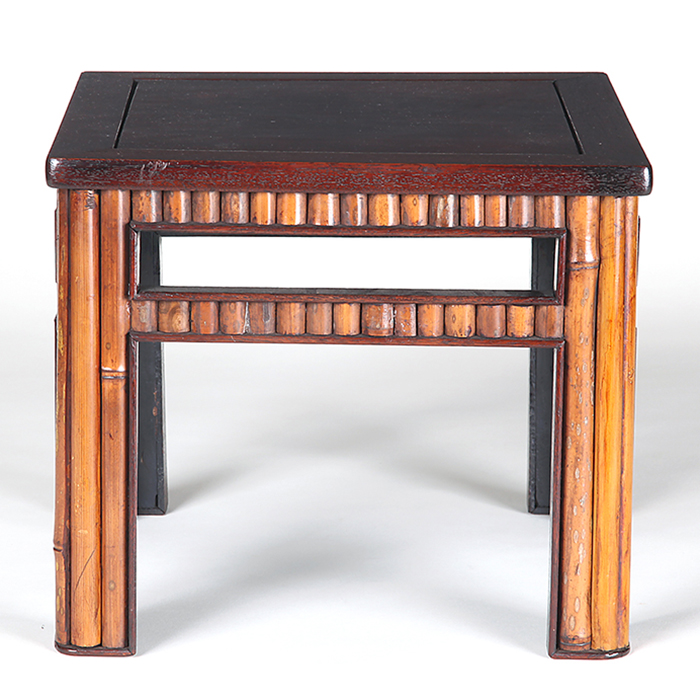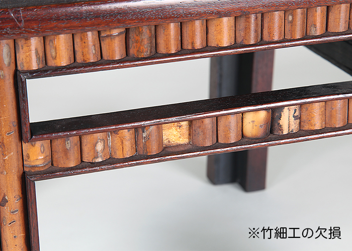 清涼感溢れる竹節細工が施され、夏飾りに最適の逸品。紫檀材を使った天板の木目も美しい。箱付。わずかなガタと竹節細工の欠損あり。