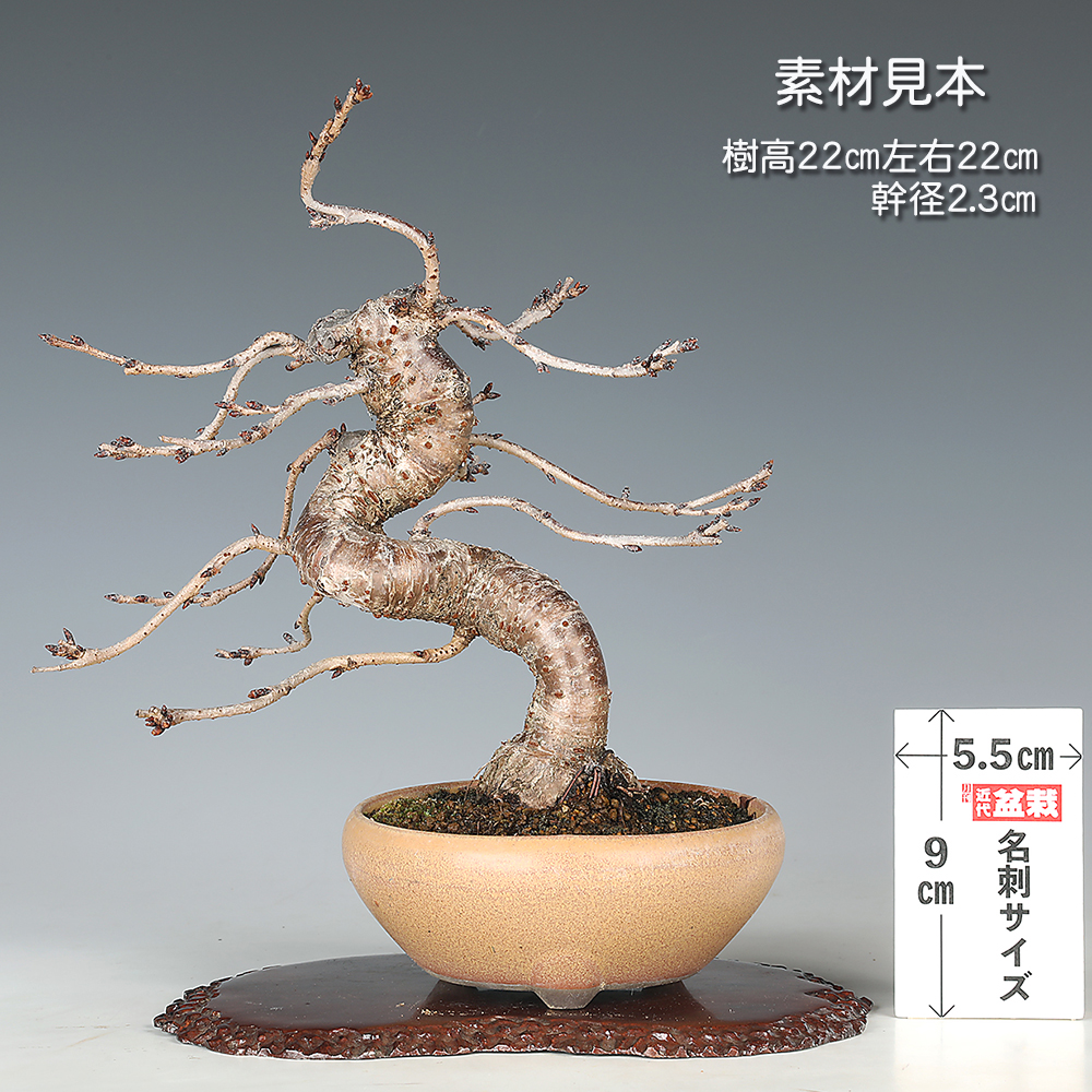 立ち上がりからの美しい線を描く太幹模様樹形で、枝配置も決まっており、すでに完成の域にあります。春の展示会で活躍間違いなしの優良素材。二季咲きの十月桜だけに秋にも飾れます。