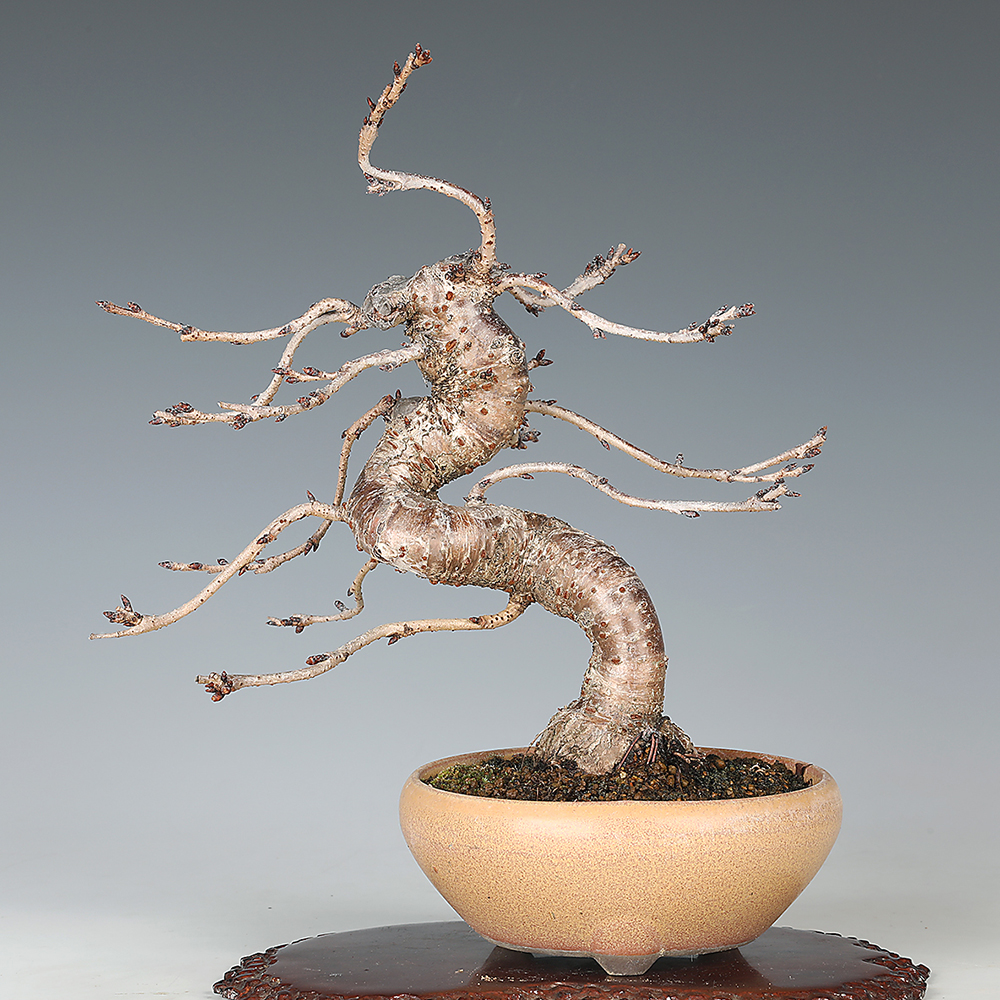 古来より日本の春を代表する花木として、誰もが愛着を持つ樹種です。盆栽としても春の展示会には欠かせない存在です。一口に桜といっても秋咲きの「十月桜」、冬に咲く「河津桜」、寒中から春先に咲く「寒桜」「緋寒桜」、春先の「彼岸桜」「山桜」「富士桜」「江戸彼岸」、そして「染井吉野」「枝垂桜」「大島桜」、晩春を彩る数々の「八重桜」や園芸品種たち。まさに桜の品種は多士済々です。