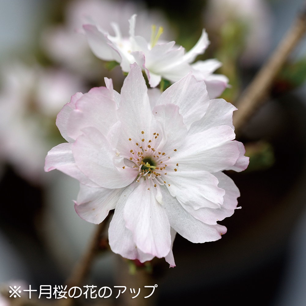 日本の春を代表する花木・桜。盆栽としても春の展示会には欠かせない存在です。「十月桜」は彼岸桜の園芸品種と言われ、白の八重花を清楚に咲かせる人気品種。10月頃から断続的に咲き、春にも咲く二季咲きです。また枝打ちが細かくできることから小品盆栽・ミニ盆栽向きの品種です。