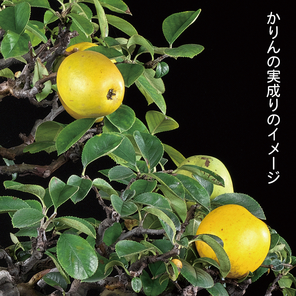 美しい黄色の実、春の可憐な桃色に花、秋の紅葉、そして独特の幹肌と一年を通して楽しめる雑木盆栽の人気樹種・かりん。実物盆栽の王様とも称されています。唐かりんは実生カリンの台木に成熟した穂木を接いだもので、比較的早く実が楽しめる品種で、初心者にもおすすめ。
