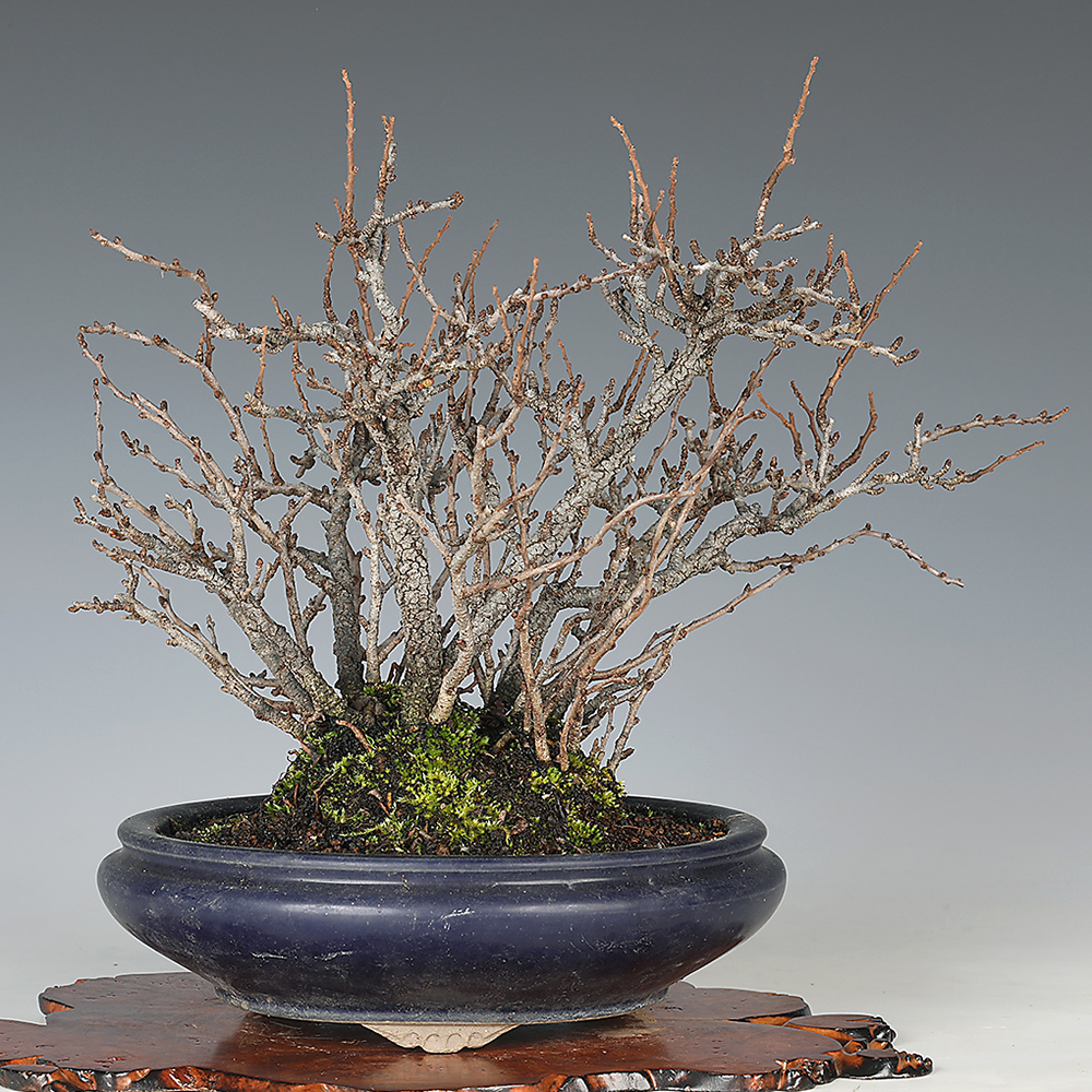 四季咲き性で冬場に花が楽しめる矮性の木瓜の仲間・長寿梅。可憐で品のある花と時代が乗り幹肌は他のはない魅力を持っています。冬場に色を添える盆栽には欠かせない樹種です。