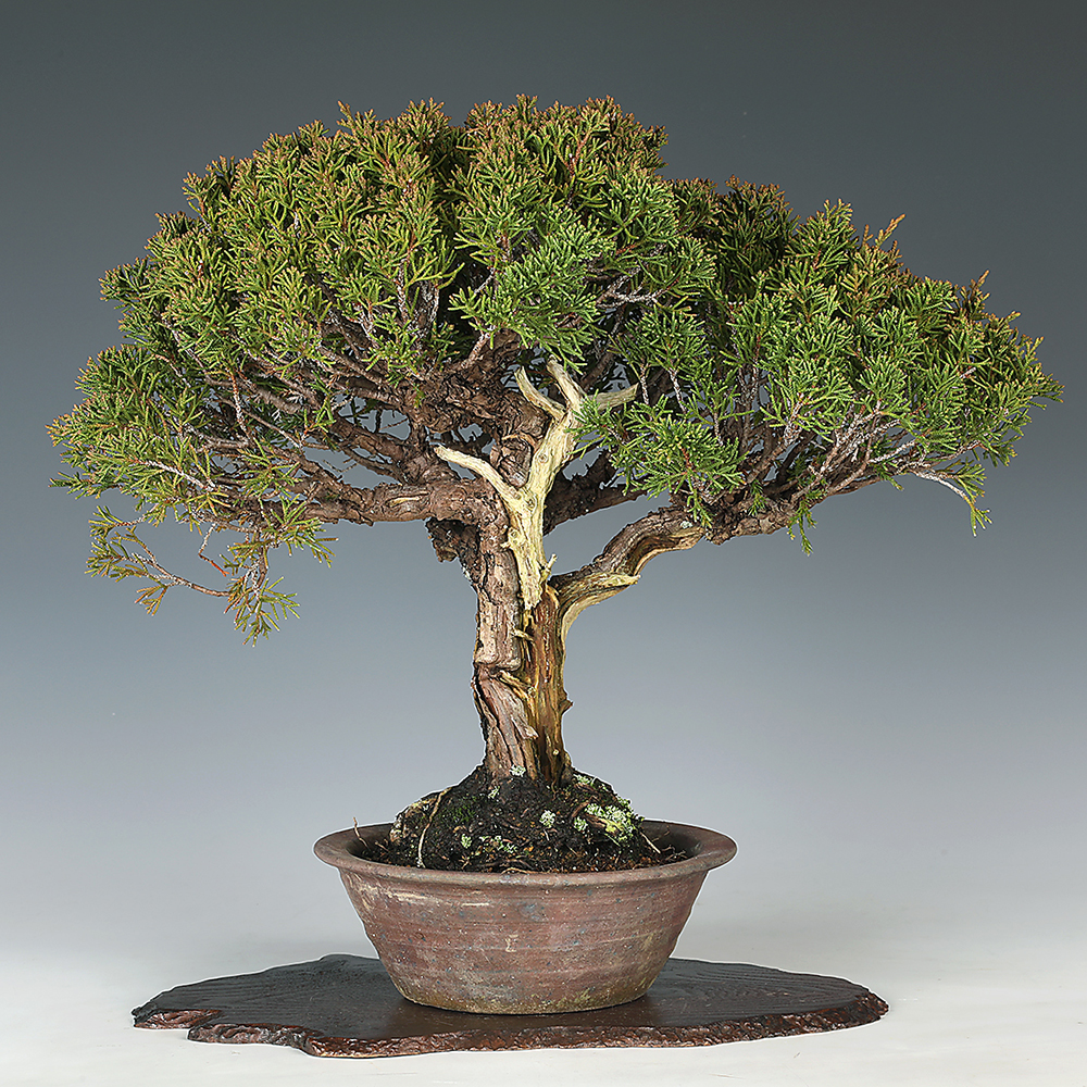 ジン・シャリの芸をはじめとする多彩かつ奔放な樹形表現で、他の樹種とは一線を画す存在です。しかも数ある盆栽樹種の中でも、最も強健で育てやすい部類に入ります。自然の厳しさと樹木のみずみずしい生命力を体現する魅力的な樹種です。