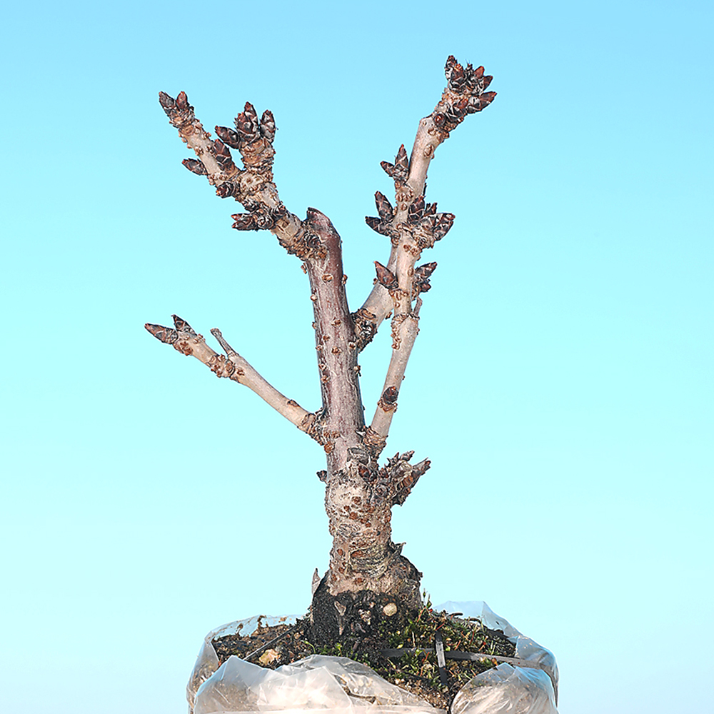 日本の春を代表する花木・桜。盆栽としても春の展示会には欠かせない存在です。自然交雑や交配から重弁の桜の園芸品種の総称として里桜と呼びますが、旭山桜はその里桜の一種。露地植えでも2mと小型で盆栽や鉢植えとして普及しています。八重咲の一才性で、花付きが良いので大変人気の品種です。