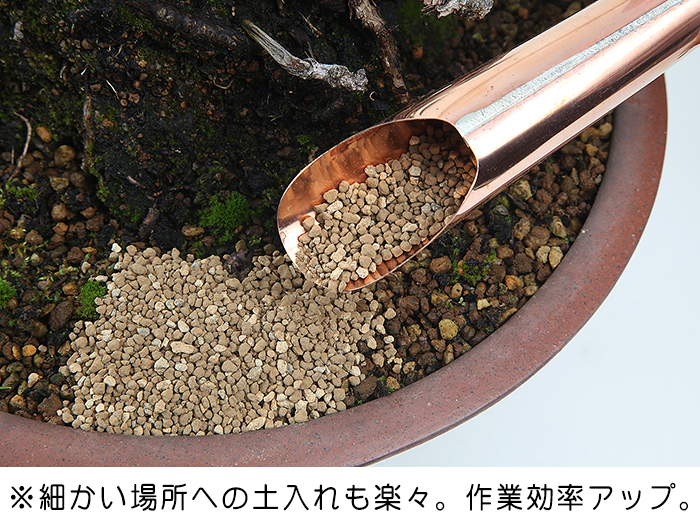 銅板で作られた日本製の高級感ある用土すくい。軽量で長さも十分にあり、狭い場所への土入れがスムーズに行えるので作業効率もアップ!
