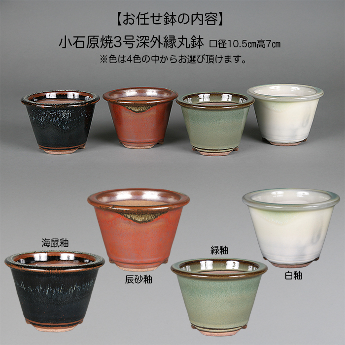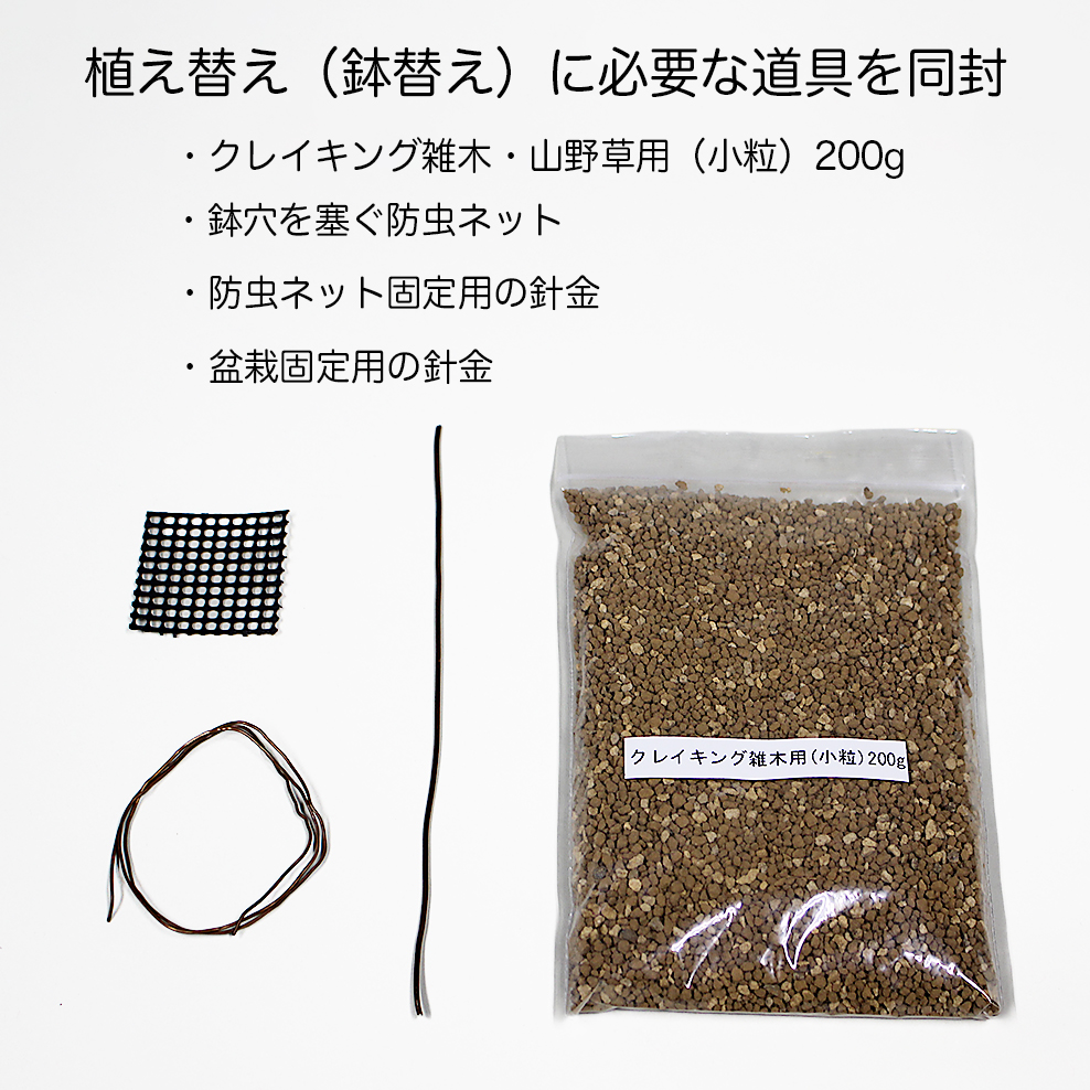 商品説明 季節の盆栽とそれに合う盆栽鉢、そして鉢替え(植え替えも可能)に必要な用土と道具(ネットと針金)を一つのパッケージにしました。 盆栽をこれから始めてみたい。盆栽を作ってみたい。盆栽を少しいじってみたい。そんなあなたにぴったりのキットです。もちろん、盆栽素材と鉢のセットが欲しい方にもお得なセット内容となっています。【盆栽について】 7.5cmビニールポット入りの雑木のミニ盆栽。季節に応じて花や実、あるいは葉姿などが楽しめる素材をご用意します。素材の選別は弊社にご一任下さい。 今回の季節の盆栽は富士桜(※品種はお任せになります)写真の素材見本:富士桜〔かすみ〕挿し木4年生 樹高20cm【盆栽鉢について】 小石原焼3号深外縁丸鉢(口径10.5cm高7cm)をご用意。この鉢は7.5cmビニールポットがそのまま入るサイズで、盆栽をビニールポットから外して、そのまま鉢にセットして少し用土を足すだけで鉢替えが可能となっています。植え替えの時期ではない。まだ本格的な植え替えに自信がない。そんな場合でも鉢替えができます。また鉢の釉薬(色)が4タイプあり、お好みで選んで頂けます。【用土について】 プロが配合、そのまま使える完全混合培養土・クレイキング・雑木山野草用(小粒)をご用意。1回の植え替えに必要な200gを同封します。【その他】・ネット(鉢穴から用土がこぼれないよう塞ぐもの)・針金(鉢とネットを固定する針金1本、盆栽を固定する針金2本)※苗木素材の為、樹形やサイズにバラツキはあります。※花芽保証素材ではありません。ご了承下さい。