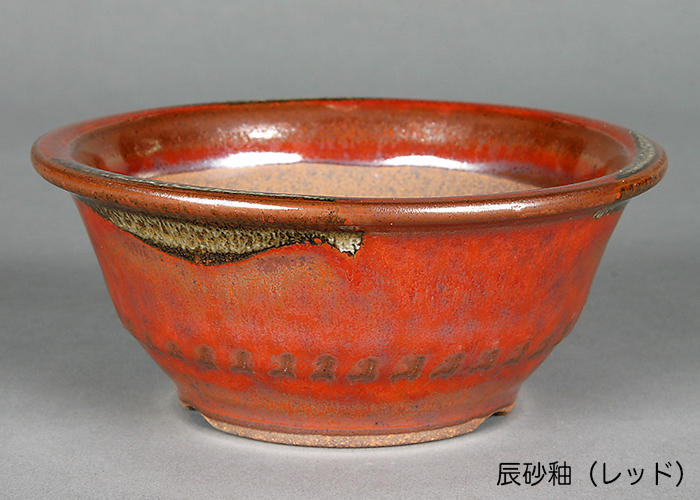 胴縄の意匠を施したデザイン性に富んだ丸鉢。椀型の優しい型は小品盆栽から山野草まで幅広く使えます。白釉・辰砂釉・海鼠釉・緑釉、各1点ずつの4点セットです。