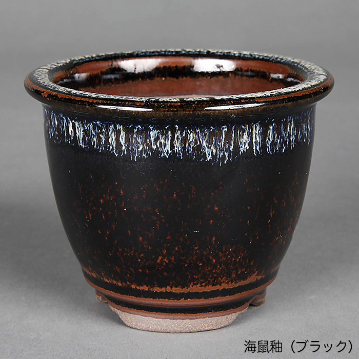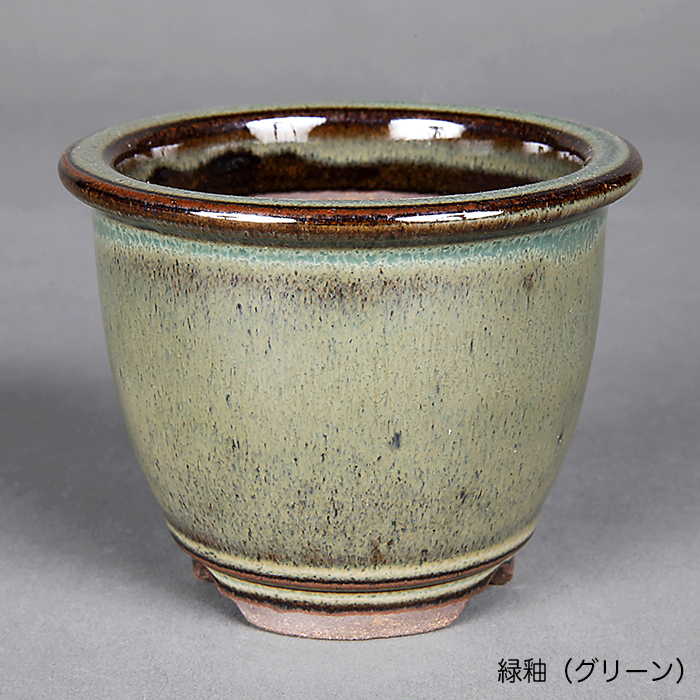 深さのある外縁丸鉢。やや椀型になった柔らかな型が魅力です。ビニールポットから簡単に植え替えられる便利な丸鉢。緑釉・白釉・海鼠釉・辰砂釉、各1点ずつの4点セットです。