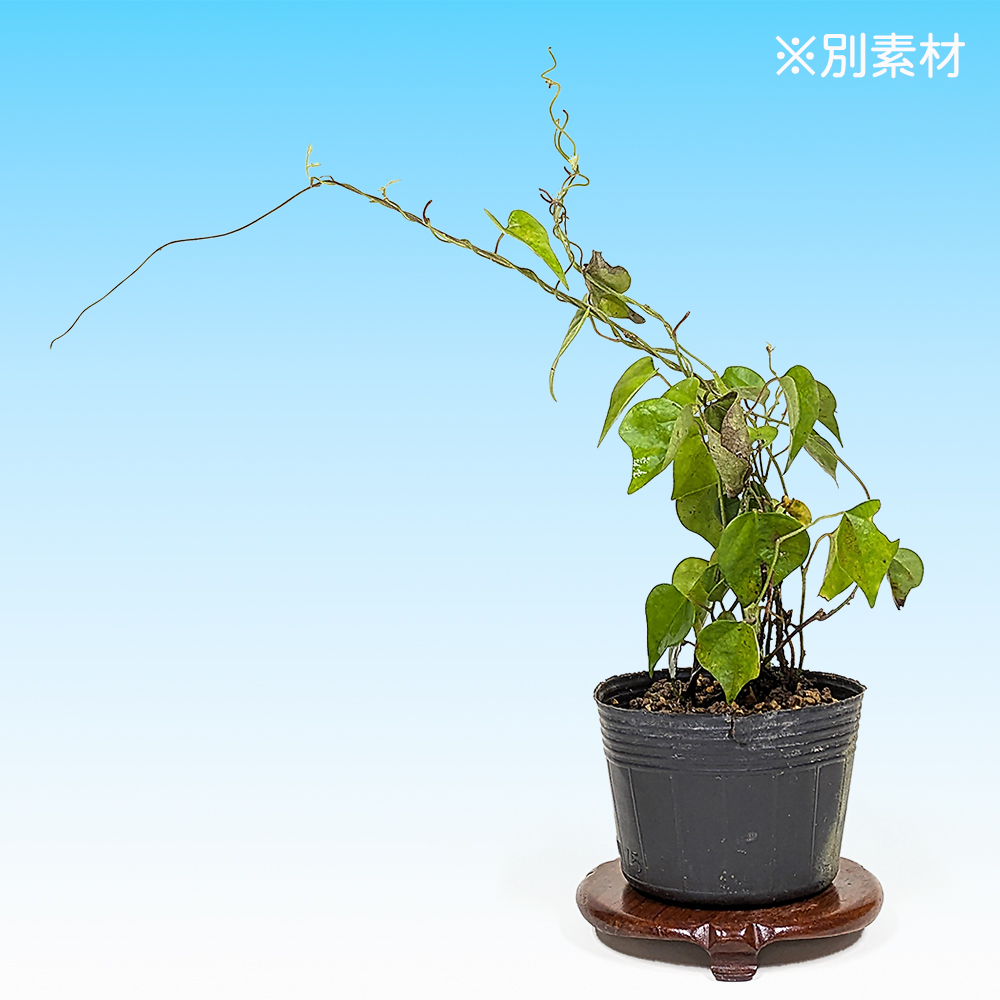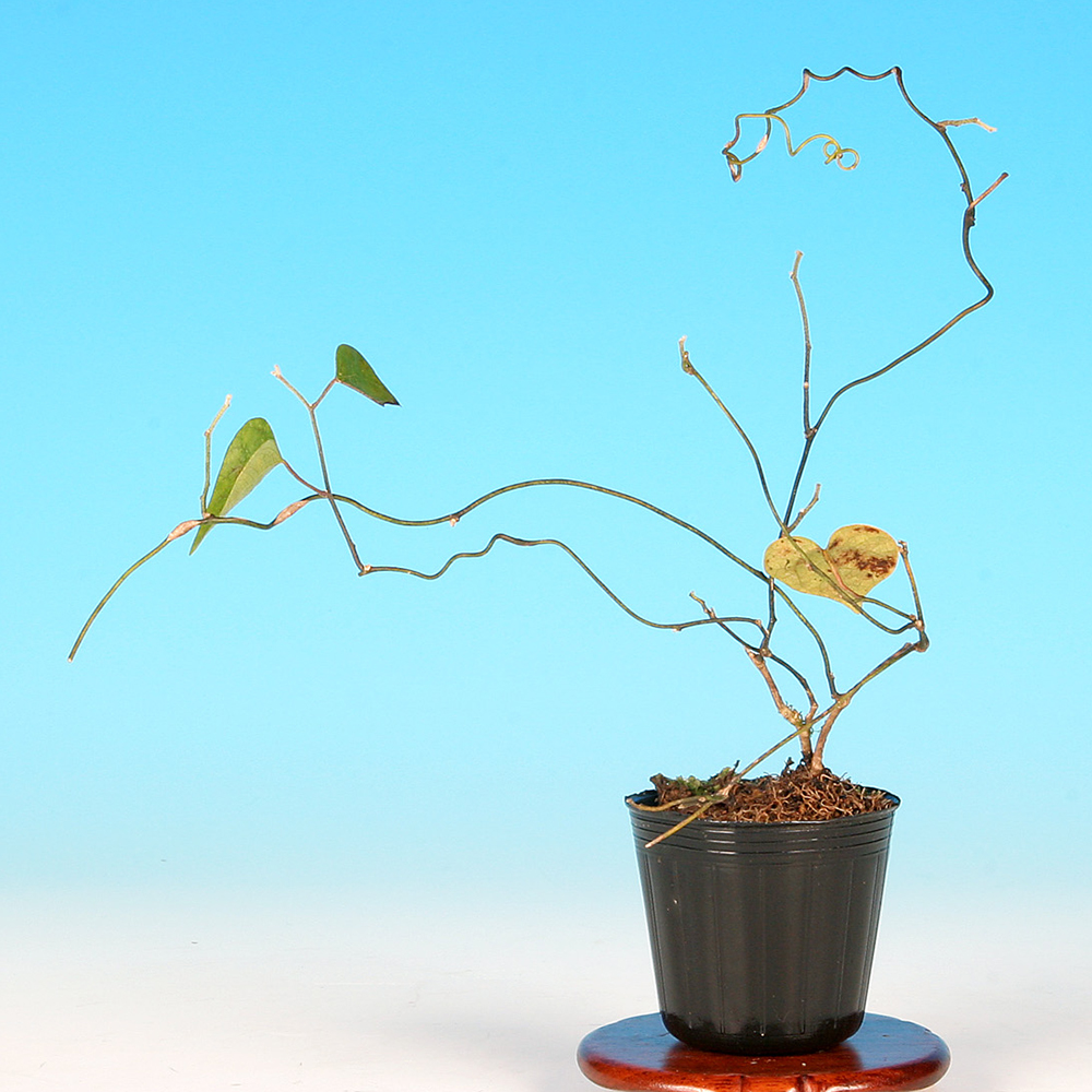 青つづらふじの交配用雄木素材です。青つづらふじは雌雄異株の樹種のため、実姿を楽しむには雄木との交配が必要不可欠。青つづらふじの雄花は黄色いオシベがあり、雌花の中心に緑のメシベがあり、それで見分けます。雄木を雌木の近くに置いて自然交配、あるいは人口交配で受粉させます。もちろん、盆栽として一から樹づくり、花姿も楽しむこともできます。