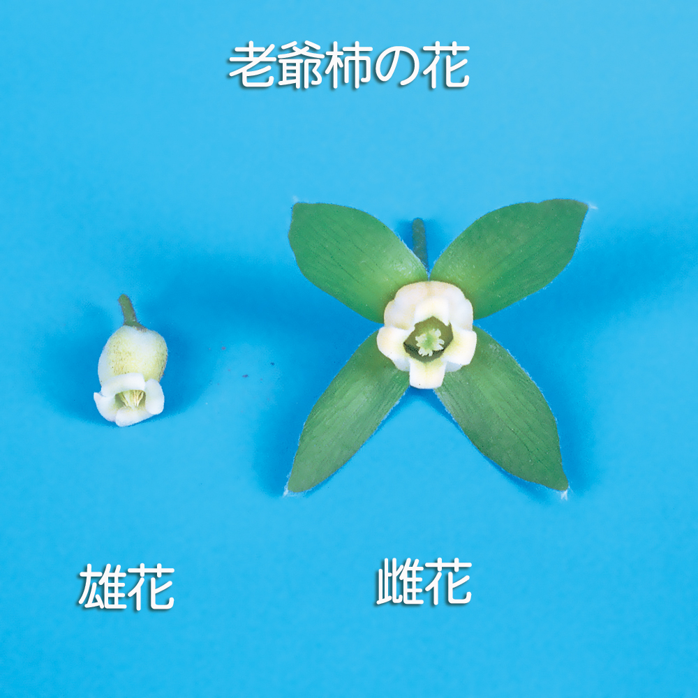 老爺柿の交配用の雄木素材です。老爺柿は雌雄異株の樹種です。雄株がなくても結実することもありますが、実成りを良くするためには雄木との交配が必要です。雌花にが4枚のガク片があり、雄花にはガク片がないため見分けは容易です。もちろん、盆栽として一から樹づくり、花姿も楽しむこともできます。