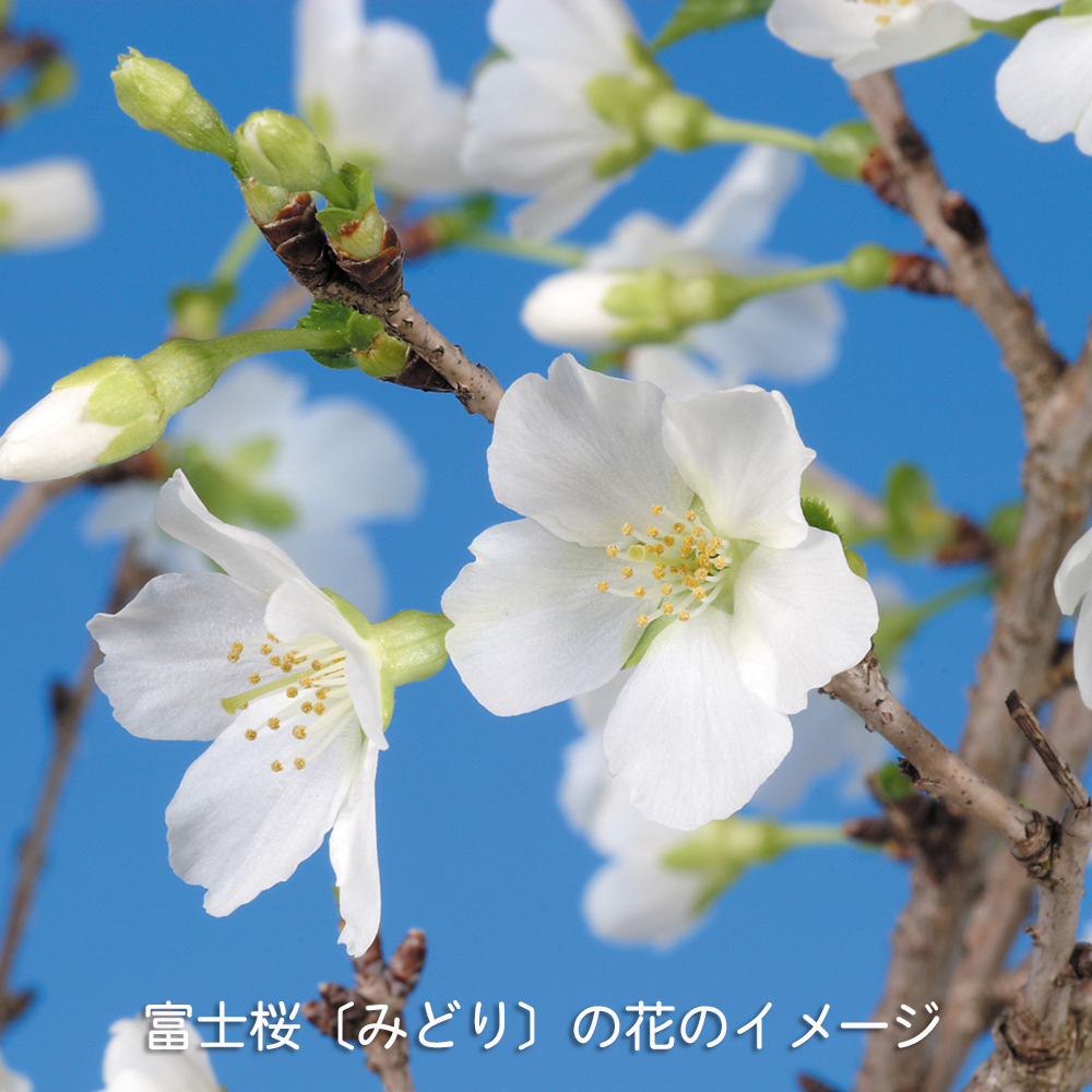 富士桜の一品種で小輪の純白の花を咲かせ、若枝、花柄、萼や萼筒が緑色になる爽やかな「ミドリザクラ」。大きく育てるのもよし。ミニ盆栽に仕立てるのよしの苗木素材。卓上で手軽にお花見を楽しんで下さい。お部屋のインテリアやガーデニングなどにもオススメ。