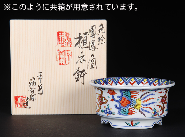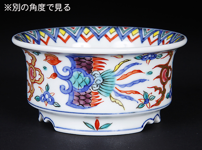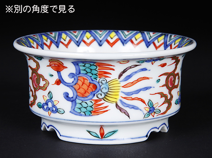 鉢型は香炉型であの真葛香山の麒麟の型を再現した高貴なデザインです。図案は「鳳凰図」。色鮮やかそしてユーモラスな絵付は古典的な図案ながらモダンな仕上がりとなっています。昭阿弥直筆の共箱付き。落款:昭阿弥