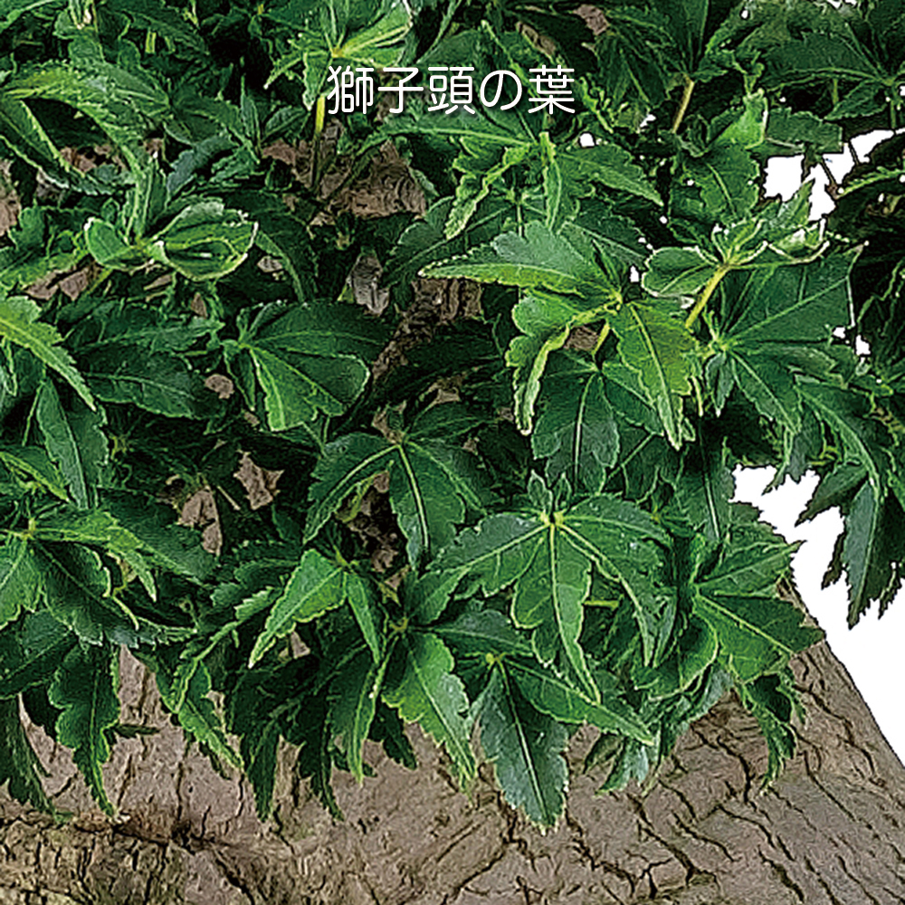 葉が深く切れ込み、縮れて密集する独特の葉芸と美しい紅葉が魅力の獅子頭。縮れて密集している葉姿を獅子(ライオン)のたてがみに見立てて付けられた名前です。樹形構想で改作や取り木素材としてなど樹づくりプランは豊富な優良素材です。