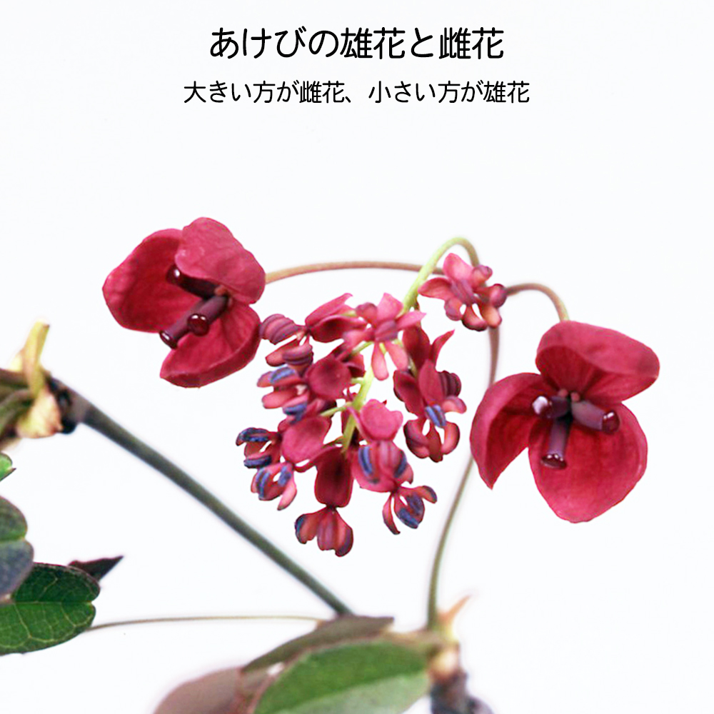 郷愁誘う実姿が味わい深い「あけび」。花・実が付きやすいとされる一才性の素材です。あけびは雄雌異花同株ですが自家不和合性のため、自家受粉では結実しにくい樹種です。他のあけびと人工交配させれば確実に実が止まります。花付きのよい一才性なので交配用としてもオススメです。? 花が咲いたら花を採取して人工交配させましょう。