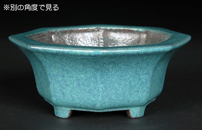 昔ながらの吹き付け技法で施釉された呂均釉は古渡鉢を彷彿されせる発色を見せています。珍しい八角型の盆栽鉢。六角鉢に比べ柔らかさがあるので懸崖・半懸崖だけでなく幅広く使えます。